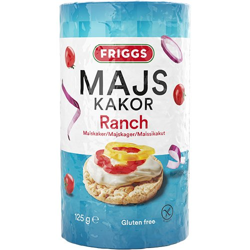 Majs Kakor Ranch 125g are crispy corn cakes flavored with tangy ranch seasoning for a savory, crunchy snack.