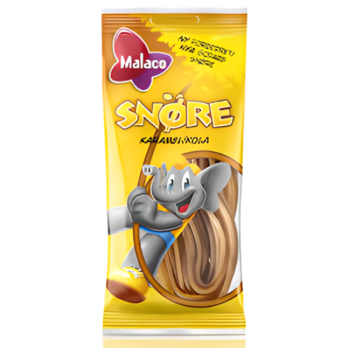 Malaco Snöre 94g features long, fruity licorice strings with a soft, chewy texture and sweet flavor.