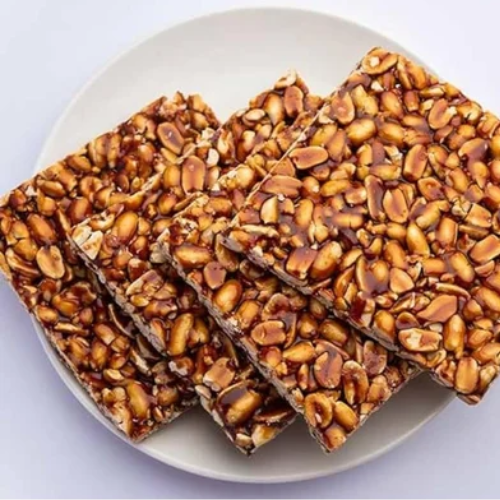 Vamaji Peanut Chikki—a crunchy and sweet traditional Indian snack made with roasted peanuts and jaggery.